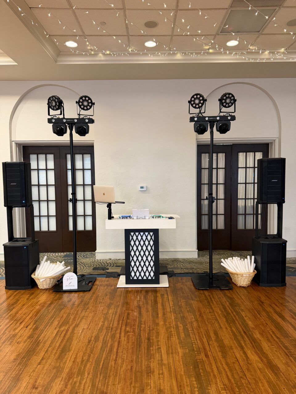 Ceremony music and microphones, cocktail hour, full reception sound, mics for speeches, and dance-floor lighting — all seamlessly covered from start to finish.